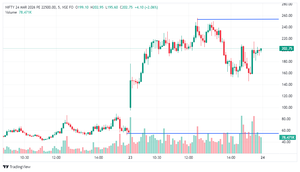 Nifty 50 Expiry के एक दिन पहले मुनाफ़ा आज दिनाँक 23/03/2026 को निफ्टी 50, 23135 से घटकर सीधे सीधे 9 बजकर 15 मिनिट पर 22636 आ गई जिससे ऑप्शन चैन की पुट में बड़ी तेजी से वुद्धि हुई।